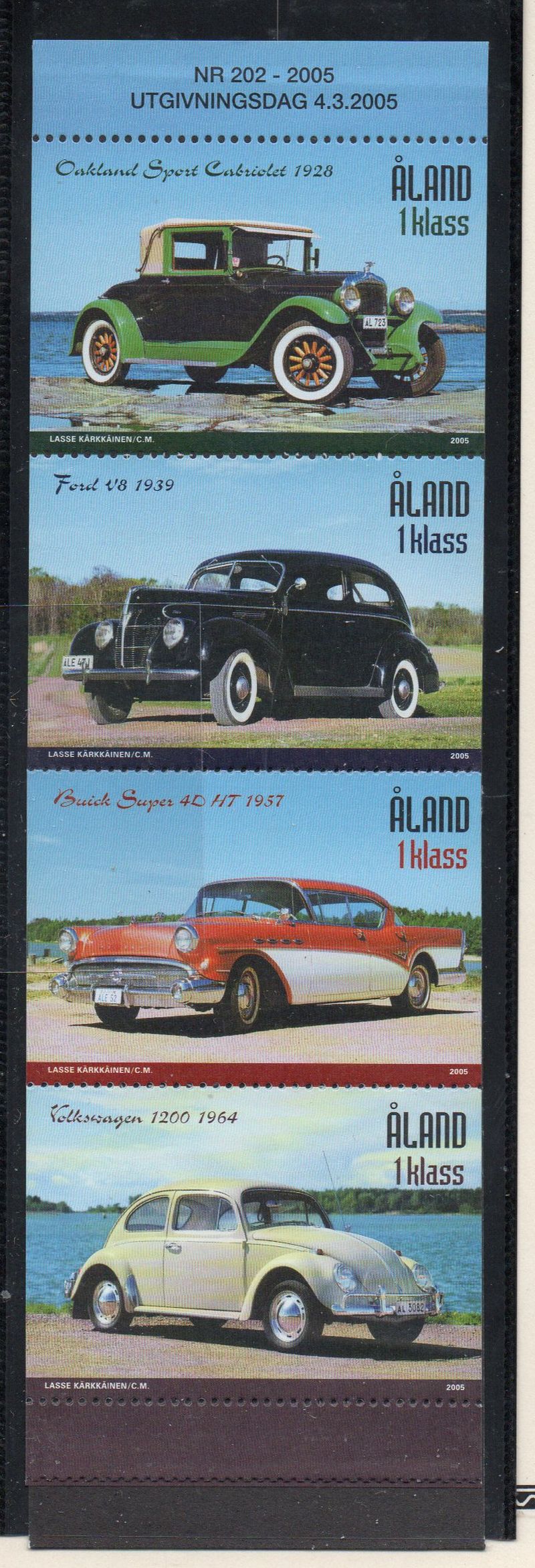 Aland Finland Scott Catalogue number 233 2005 Automobiles stamp set .Mint fine to very fine, original gum never hinged .Member Canadian Stamp Dealers Association .Canadian Customers - I pay the GST/HST on your purchases from me .