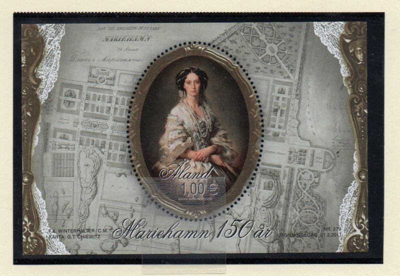 Aland ( Finland ) Scott Catalogue number  313  2011 Princess Marie, 150th Anniversary Mariehamn stamp souvenir sheet .Mint, fine to very fine, original gum never hinged.Member Canadian Stamp Dealers Association . Canadian Customers - I pay the GST/HST on your purchases from me .
