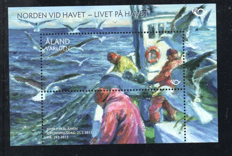 Aland ( Finland ) Scott Catalogue number  327 2012 Fishermen at Sea stamp souvenir sheet .Mint, fine to very fine, original gum never hinged.Member Canadian Stamp Dealers Association . Canadian Customers - I pay the GST/HST on your purchases from me .
