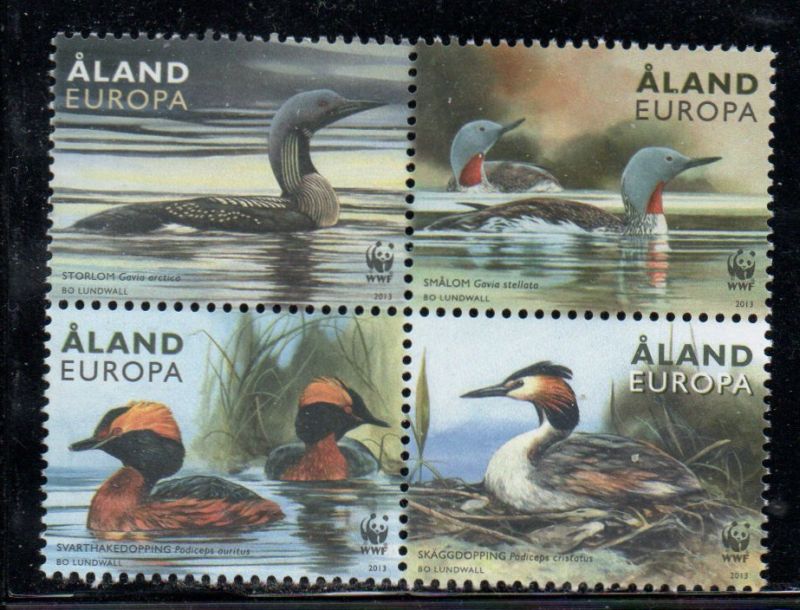 Aland ( Finland ) Scott Catalogue number 340 2013 Birds. World Wildlife Fund stamp block of 4 .Mint, fine to very fine, original gum never hinged.Member Canadian Stamp Dealers Association . Canadian Customers - I pay the GST/HST on your purchases from me .