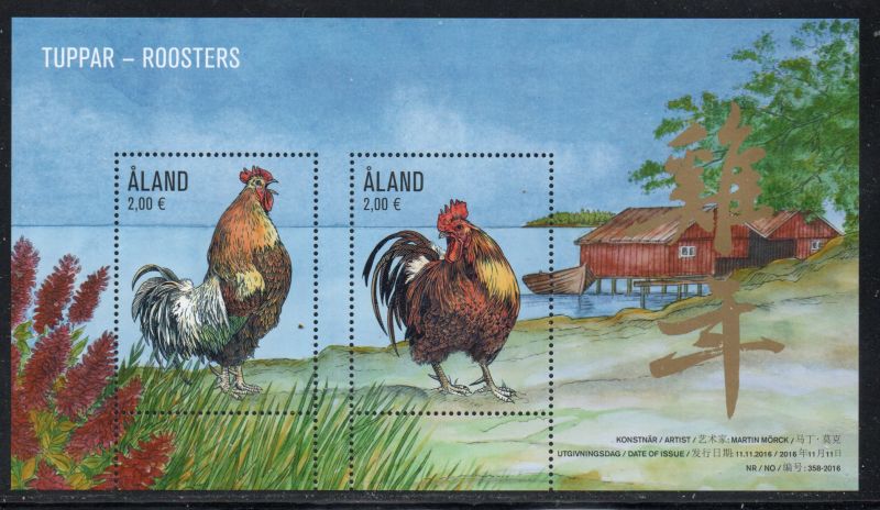 Aland ( Finland ) Scott Catalogue number 389 2016 Year of the Rooster stamp souvenir sheet .Mint, fine to very fine, original gum never hinged.Member Canadian Stamp Dealers Association . Canadian Customers - I pay the GST/HST on your purchases from me .
