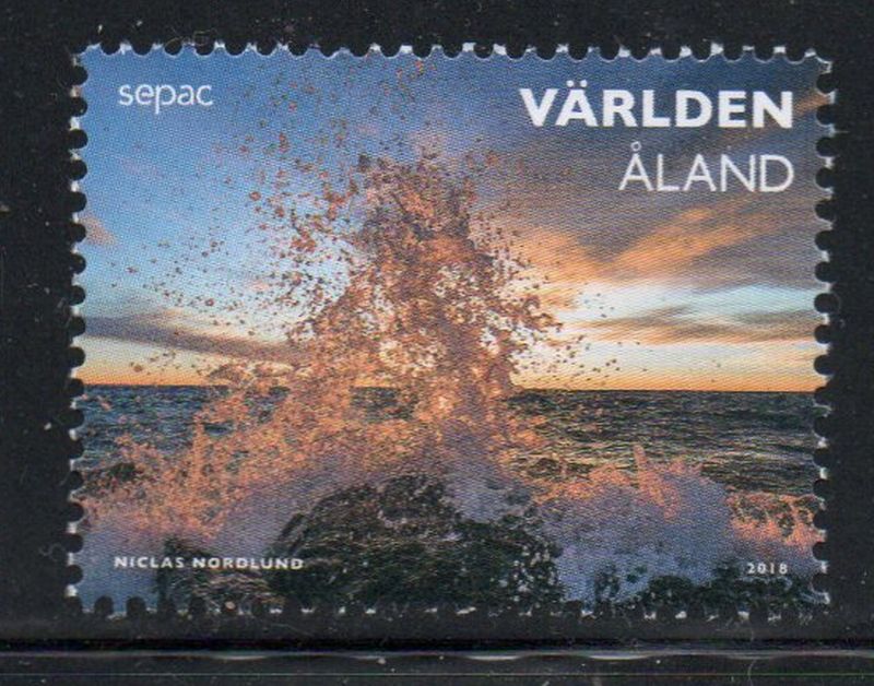 Aland ( Finland ) Scott Catalogue number 407 2018 Wave Hitting Rock stamp .Mint, fine to very fine, original gum never hinged.Member Canadian Stamp Dealers Association .
