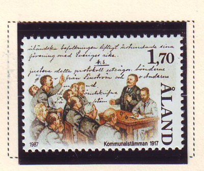 Aland ( Finland) Scott Catalogue number 28 1987 Reunification with Sweden Movement stamp .Mint, fine to very fine, original gum never hinged . Member Canadian Stamp Dealers Association . Canadian Customers - I pay the GST/HST on your purchases from me .