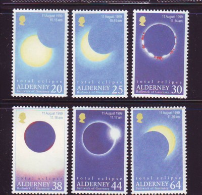 Alderney Scott Catalogue number 128-133 1999 Total Solar Eclipse stamp setMint, fine to very fine original gum never hinged .Canadian Customers - I pay the GST/HST on your purchases from me