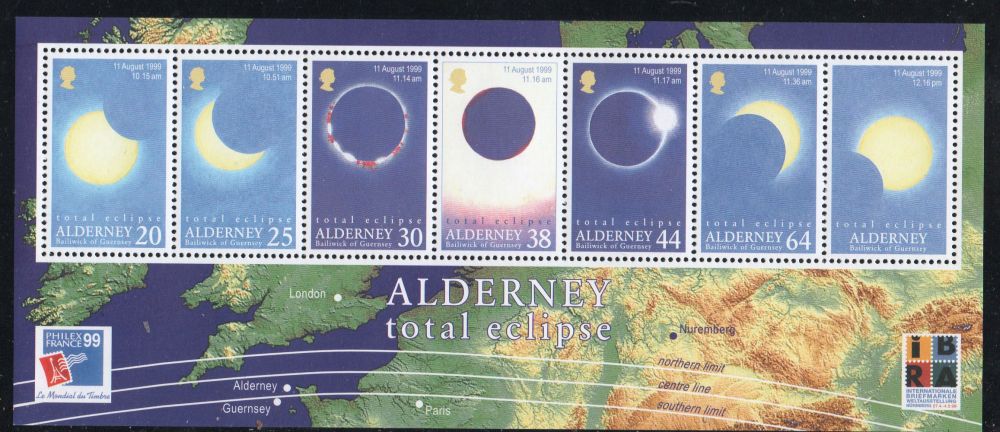 Alderney Scott Catalogue number 133a 1999 Total Solar Eclipse stamp souvenir sheetMint, fine to very fine original gum never hinged .Canadian Customers - I pay the GST/HST on your purchases from me