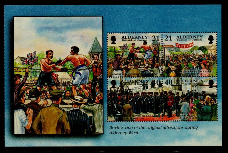 Alderney Scott Catalogue number 162b 2000 21p & 40p  Garrison Island stamp booklet pane of 4 Boxing Match on selvedge .Mint, fine to very fine , original gum never hinged .Member Canadian Stamp Dealers Association .Canadian Customers - I pay the GST/HST on your purchases from me .