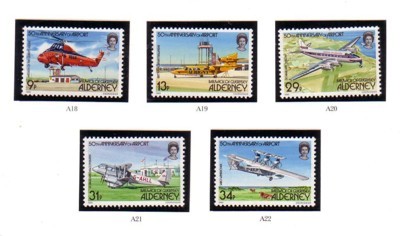 Alderney Scott Catalogue number 18-22 1985 50th Anniversary Airport stamp set .Mint, fine to very fine original gum never hinged .Canadian Customers - I pay the GST/HST on your purchases from me .