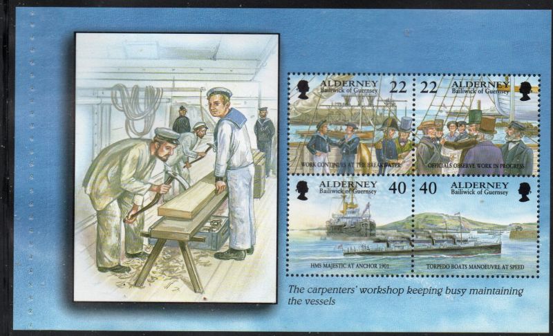 Alderney Scott Catalogue number 183b 2000 22p & 40p  Garrison Island stamp booklet pane of 4  Carpenters on selvedge.Mint, fine to very fine , original gum never hinged .Member Canadian Stamp Dealers Association .Canadian Customers - I pay the GST/HST on your purchases from me .