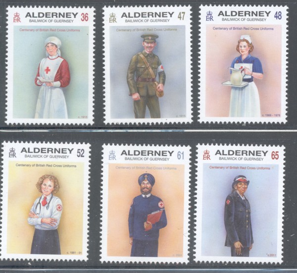 Alderney Scott Catalogue number 415-420 2011 Red Cross Uniforms stamp set .Mint, fine to very fine original gum never hinged .Canadian Customers - I pay the GST/HST on your purchases from me