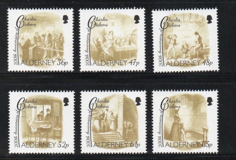 Alderney Scott Catalogue number 434-439 2012 200th Anniversary Birth of Charles Dickens stamp set . Mint, fine to very fine original gum never hinged .