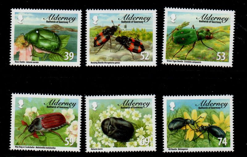 Alderney Scott Catalogue number 459-464 Beetles stamp set .Mint, fine to very fine original gum never hinged .Canadian Customers - I pay the GST/HST on your purchases from me