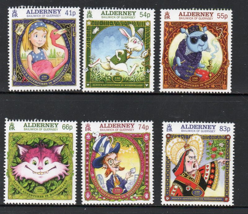 Alderney Scott Catalogue number 512-517 2015 150th Anniversary Publication of Alice in Wonderland stamp set.Mint, fine to very fine original gum never hinged .Canadian Customers - I pay the GST/HST on your purchases from me