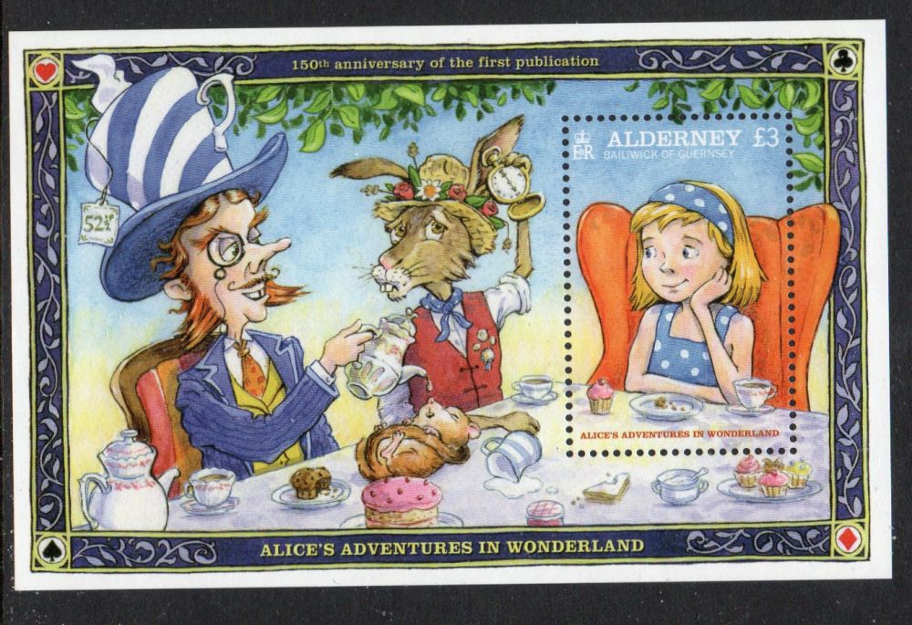 Alderney Scott Catalogue number 518 2015 150th Anniversary Publication of Alice in Wonderland stamp souvenir sheet.Mint, fine to very fine original gum never hinged .Canadian Customers - I pay the GST/HST on your purchases from me