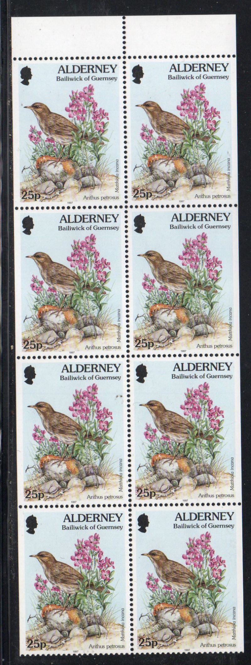 Alderney Scott Catalogue number 99b 1997 25p Bird & Flower stamp booklet pane of 8 .Mint, fine to very fine , original gum never hinged .Member Canadian Stamp Dealers Association .Canadian Customers - I pay the GST/HST on your purchases from me .
