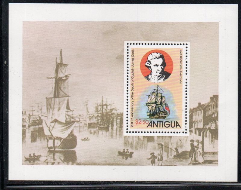 Antigua Scott Catalogue number 551 1979 Capt. Cook stamp souvenir sheet .Mint, fine to very fine original gum never hinged ,Member Canadian Stamp Dealers Association .Canadian Customers - I pay the GST/HST on your purchases from me