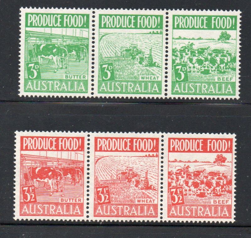 Australia Scott Catalogue number 252a, 255a 1953 Prodcue Food stamp strips of 3 .Mint, fine to very fine, original gum never hinged.Canadian Customers - I pay the GST/HST on your purchases from me .21-8-131.jpg