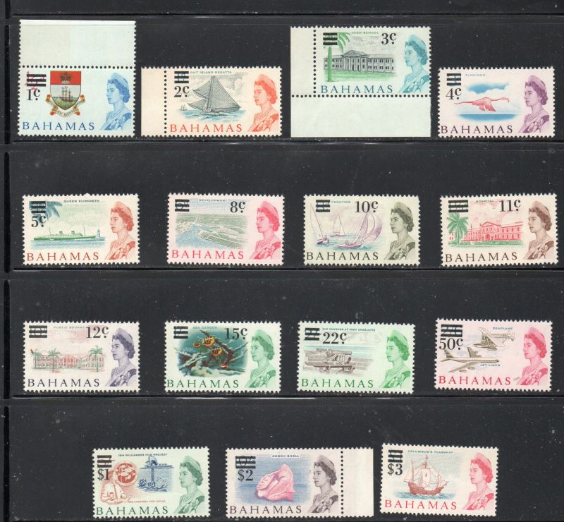 Bahamas Scott Catalogue number 230-244 1966 Decimal conversion overprinted long stamp set . .Mint, fine to very fine, original gum never hinged .Member Canadian Stamp Dealers Association .Canadian Customers - I pay the GST/HST on your purchases from me .25-6-15.jpg