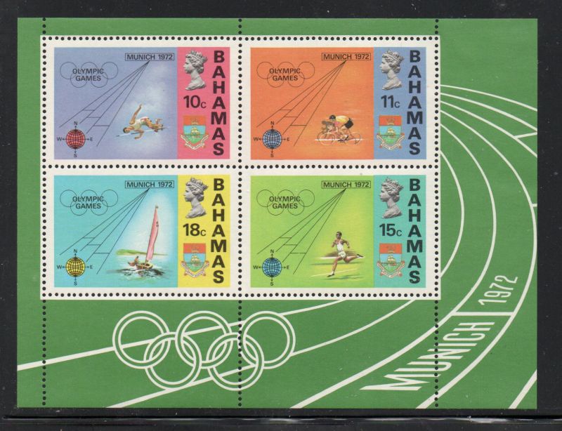 Bahamas Scott Catalogue number 338a 1972 Munich Olympics stamp souvenir sheet .Mint, fine to very fine, original gum never hingedMember Canadian Stamp Dealers Association .Canadian Customers - I pay the GST/HST on your purchases from me .