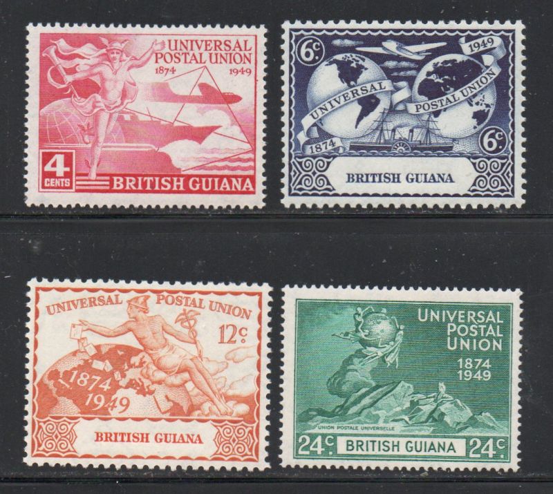 British Guiana Scott Catalogue number 246-249 1949 75th Anniversary Universal Postal Union stamp set .Mint, fine to very fine, original gum hinged . .Canadian Customers - no added GST/HSTUS customers - No tariffs on stamps sent by meMember Canadian Stamp Dealers Association25-6-115.jpg