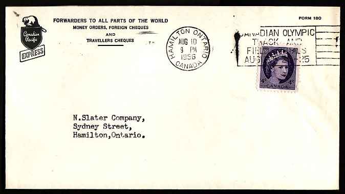 Scan #10586 - 4c QEII Wilding - Wentworth County - Hamilton, Ont - Aug 10 1956 -Slogan cancellation "Canadian Olympic track and field trials August 24-25" - CC illustrated advertising "Canadian Pacific Express" - 4c franking pays the local letter rate -