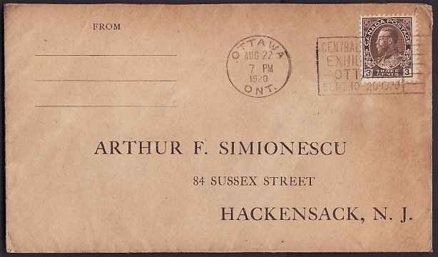 Scan #10597 - 3c Admiral - Carleton County - Ottawa, Ont - Aug 22 1920 - Slogan cancellation "Central Canada Exhibition Ottawa Sept 10-20 1920" -