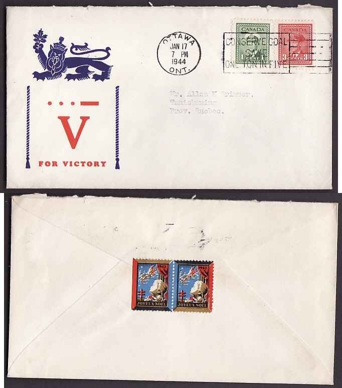 Scan #10819 - 1c + 3c KGVI war - Carleton County - Ottawa, Ont - Jan 17 1944 - patriotic cachet " ... - V for Victory" - two 1943 Christmas seals seal the back flap -
