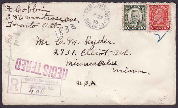 Scan #10872 - 3c KGV medallion + 10c Cartier registered to USA - York County - Toronto, Ont Sub No.30 - Ap 27 1933 -
