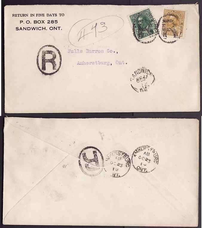 Scan #11008 - 1c + 7c Admirals registered - Essex County - Sandwich, Ont single broken circle - Oc 22 1918 -