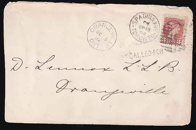 Scan #11096 - 3c Small Queen-York Cnty-Spadina Ave,Toronto duplex-Sp 18 1892 - H/S "Not Called For" -
