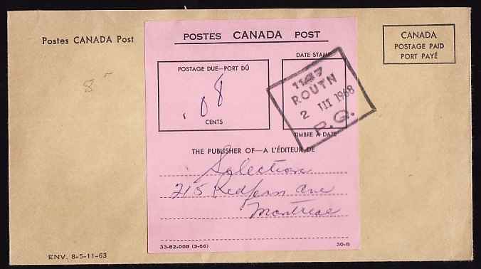 Scan #11110 - "Canada Postage Paid" envelope with postage due label [ 33-82-008(3-66) ] for 8 cents - Rouyn, PQ - 2 III 1968 - charge to Reader's Digest for a selection of their mailing shortpaid -