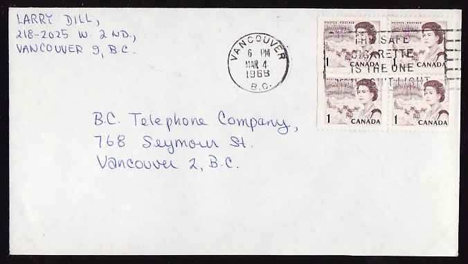 Scan#12016-1c(block of 4) Centennial on cover-Vancouver,BC-Mar 4 1968-4c franking pays the drop letter rate -Member of the Canadian Stamp Dealers Association and have been serving the collector since 1975.Canadian buyers - I will cover your GST/HST costs .