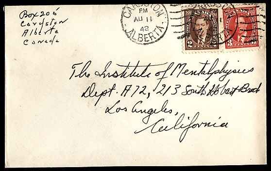 Scan #12430 - 2c + 3c KGVI mufti to California - Cardston, Alberta duplex [ DAB-103 ] - PM Au 11 1942 - 5c franking pays the double [ 3c + 2c ] letter rate to the USA -