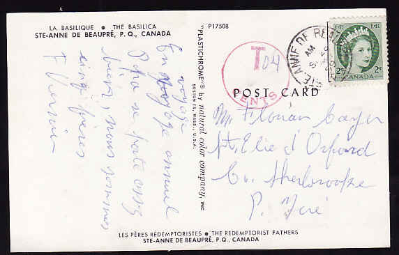 Scan #12520 - 2c QEII Wilding shortpays the 4c p/c rate thus postage due marking "T/04cents" - Ste Anne de Beaupre, PQ cds - Sp 28 1959 -