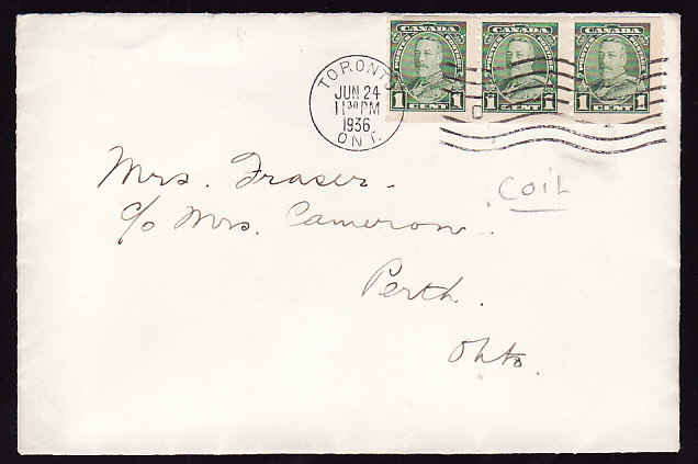 Scan #12867 - 1c(strip of 3) KGV pictorial coil [#228] - York County - Toronto, Ont - Jun 24 1936 -Member of the Canadian Stamp Dealers Association and have been serving the collector since 1975.Canadian buyers - I will cover your GST/HST costs .