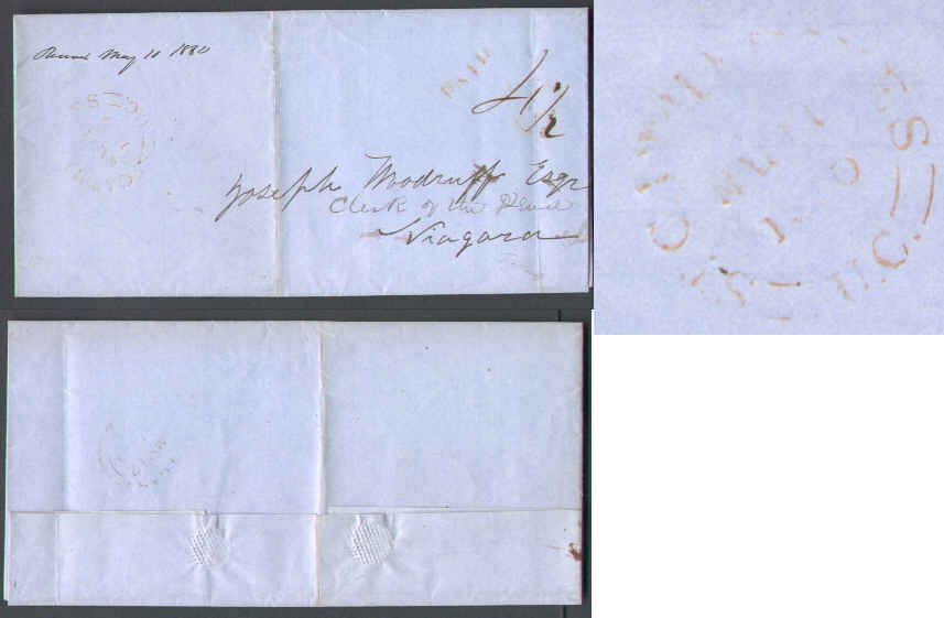 #6104 - Stampless-Lincoln County-St. Catherines,UC-My 11 1860,double broken circle 30mm-rated 4&1/2 H/S "PAID" -B/S Niagara My 12 1860 -