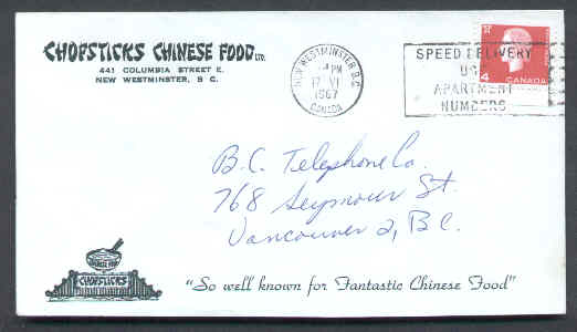 #8800-4c QEII Cameo-New Westminister BC,Canada-17 VI 1967-CC Illustrated "Chopsticks Chinese Food Ltd." - Member of the Canadian Stamp Dealers Association and have been serving the collector since 1975.Canadian buyers - I will cover your GST/HST costs .