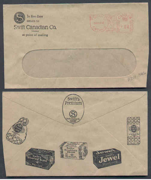 #8806 - 4c meter #140048 on window envelope - York County-Toronto,Ont-Mar 14 1945-all over back advertising "Swift Canadian Co." -