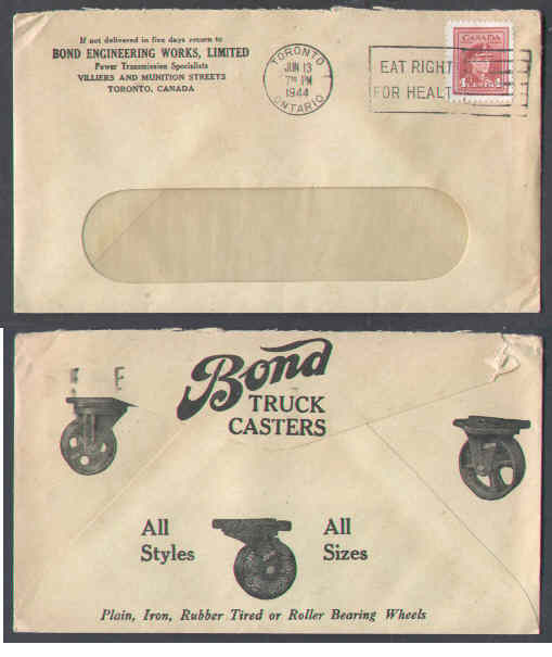 #8820 - 4c KGVI War - York County-Toronto,Ont-Jun 13 1944 - slogan "Eat right for Health" - all over advertising on back-" Bond Truck Casters" -