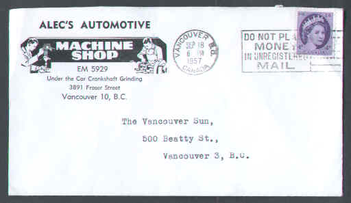 #8867-4c QEII Wilding-Vancouver,BC-Sep 18 1957-CC illustrated "Alec's Automotive , Machine Shop" Member of the Canadian Stamp Dealers Association and have been serving the collector since 1975.Canadian buyers - I will cover your GST/HST costs .