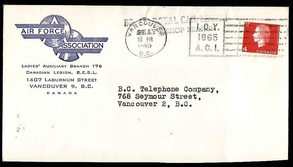 #8869-4c QEII Cameo-Vancouver,BC-Apr 6 1965- CC illustrated "Air Force Association , Ladies Auxillary Branch 176" Member of the Canadian Stamp Dealers Association and have been serving the collector since 1975.Canadian buyers - I will cover your GST/HST costs .