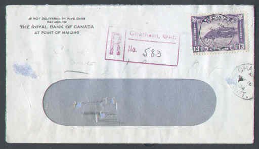 #8942 - 13c Quebec Citadel reg'd-Kent Cty-Chatham,Ont-Jan 16 1934- pencil notations suggest letter was returned to the bank