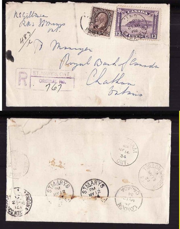 #8943 - 2c Medallion+13c Quebec Citadel reg'd-Perth Cnty -St. Marys,Ont-My 12 1934-15c franking pays the double weight domestic letter rate [3c + 2c]+10c registration rate -