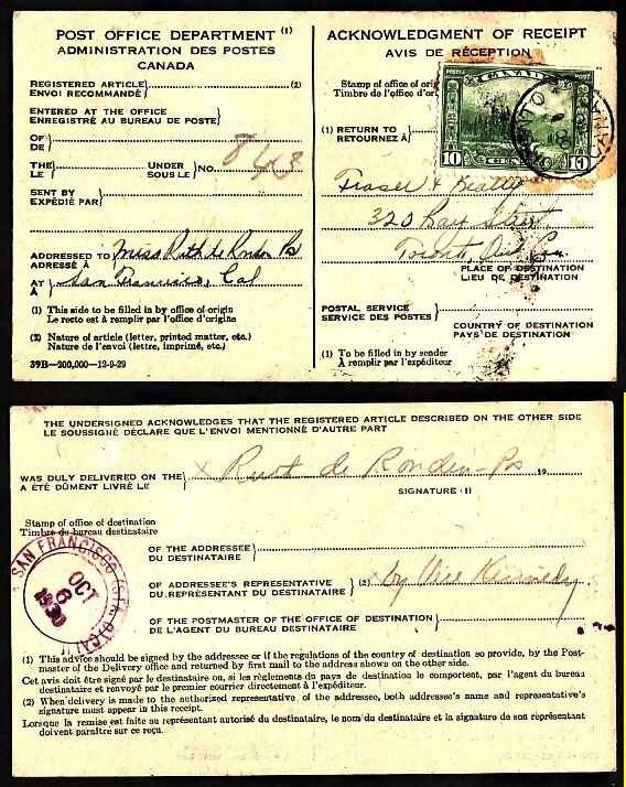 #9438 - 10c Mount Hurd on AR card - York County - Toronto , Ont - Oc 1 1930 - 10c franking pays the fee for the Acknowledge of Receipt card for registered mail - short tear in card above stamp-
