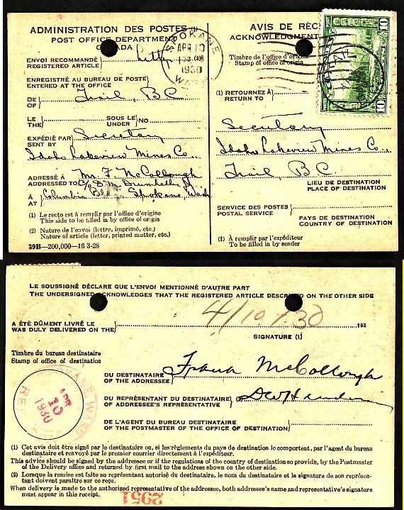 #9439 - 10c Mount Hurd on AR card - Trail , BC - Ap 10 1930 -10c franking pays the fee for the Acknowledge of Receipt card for registered mail -