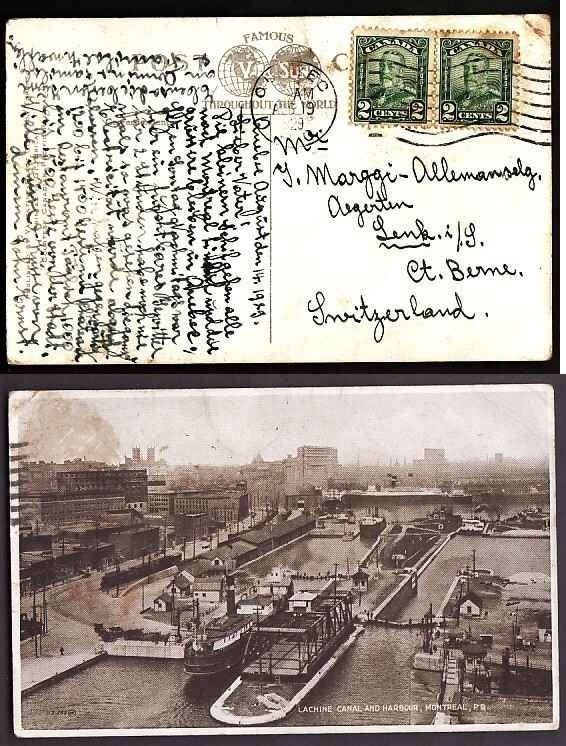 ListingDetailsSellerHistoryShippingQuestion#9472 - 2c(2) KGV scroll on p/c to Switzerland - Quebec , PQ - Aug 19 1929 - 4c franking pays the UPU postcard rate to SwitzerlandAdd to Cart