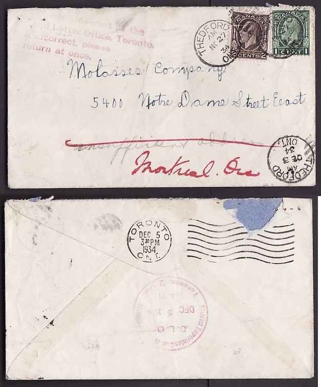#9506 - 1c+2c KGV medallions-Lambton Cnty-Thetford,Ont-Nov 27 1934-M/S "insufficient address " stroked out and written in "Montreal , Que" - H/S "Address amended at the Dead Letter Office , Toronto ,. If incorrect please return at once." - B/S "D.L.O. Dec 5 1934 , Toronto 2 Ont." -