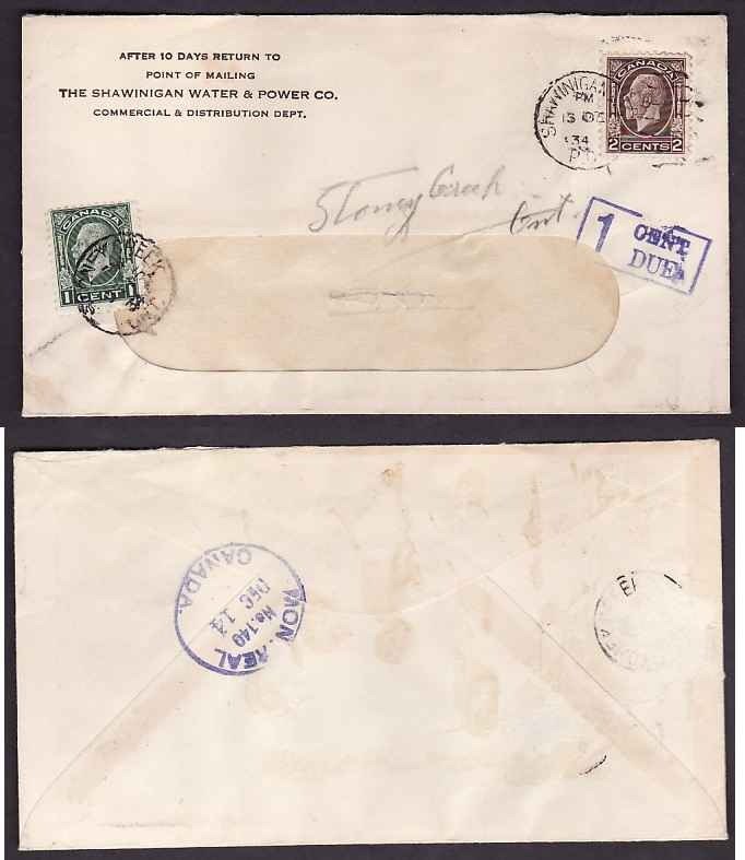#9540 - 2c KGV medallion-Shawinigan Falls,PQ-13 De 1934-2c franking pays the drop letter rate but when it was re-directed to [Wentworth County] Stoney Creek , Ont , the rate became 3c - H/S "1 cent due" - at Stoney Creek the 1c stamp was added and cancelled De 15 , 1934 - CC "The Shawinigan Water & Power Co." -