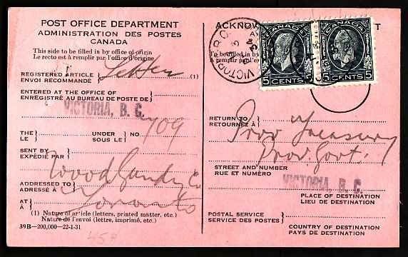 #9543 - 5c(2) Medallion on AR card-Victoria,BC-De 3 1934-10c franking pays the fee for the Acknowledge of Receipt card for registered mail