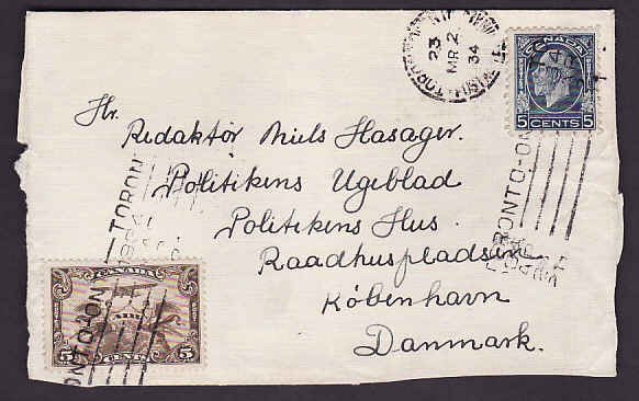 #9544 - 5c Medallion+5c Airmail on front only to Denmark-York County-Toronto,Ont-Mr 2 1934-10c franking pays the airmail rate to Europe [by ship transatlantic and by air in Canada & Europe ] -