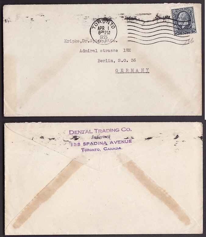 #9563 - 5c KGV medallion to Germany-York County-Toronto,Ont-Apr 1 1935- 5c franking pays the UPU letter rate to Germany
